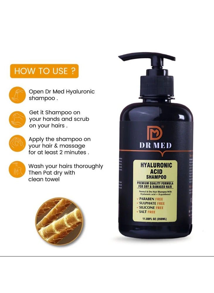 How to Use: Wet Hair: Thoroughly wet your hair with lukewarm water. Apply Shampoo: Take an adequate amount of DR MED Hyaluronic Acid Shampoo and apply it evenly to your scalp. Massage & Lather: Gently massage the shampoo into your scalp with your fingertips, working it through the lengths of your hair. Create a rich lather. Rinse: Rinse out the shampoo thoroughly with lukewarm water. Repeat (if necessary): For exceptionally oily or dirty hair, you can repeat the process. Follow with Conditioner: For optimal results, follow with DR MED Hyaluronic Acid Conditioner for added hydration and nourishment. Ingredients: Water, glycerin, cetearyl alcohol, ceteartrimontum chloride, methylisothiazolinone,amodimethicone, ceirimonium chloride, trideceth-10,perfume, hydrogenated olive oil. tetrasodium edia, citric acid, methy/chloroisothlazolinone,behentrimontum chloride, keratine,peg-14m, kernel oil
